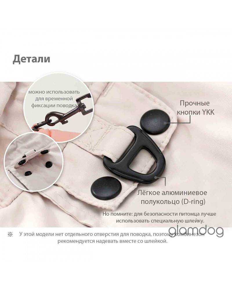 — Всё крепко и стильно. Качественные кнопки YKK и лёгкое кольцо, на которое можно закрепить поводок, но лучше использовать шлейку.